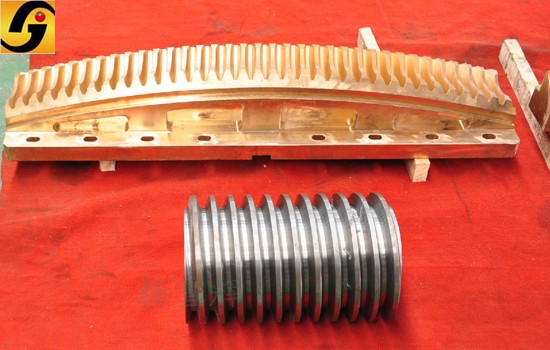 蝸輪的輪齒也與蝸桿一樣,加工有左右不同的齒面,但因?yàn)槲佪喪菆A柱齒輪,所以所有輪齒的齒距相等。